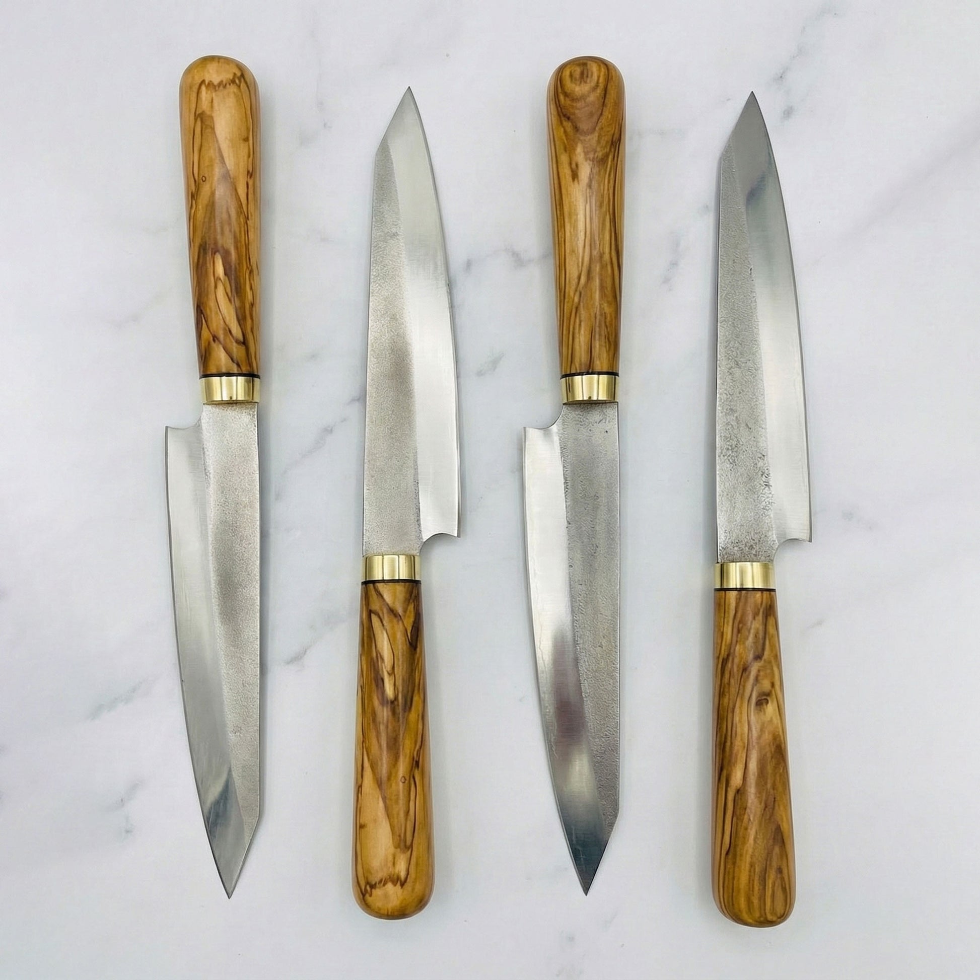 The K1 Chef’s knife is the all-around utility knife for all tasks intended to be done on the cutting board. This means it’s the most reached-for tool in the kitchen, capable of handling nearly anything you put in front of it. It is a Mediterranean-edged knife with a 210mm long blade, a balanced 50/50 grind, and a spine that begins at 3mm in thickness and gently tapers toward the tip. This one is crafted Kiritsuke style from 4116 high-performance stainless steel and finished with a clean, understated satin sheen. The handle is shaped from beautifully grained olive wood and features a single brass mosaic pin carrying the chef’s emblem